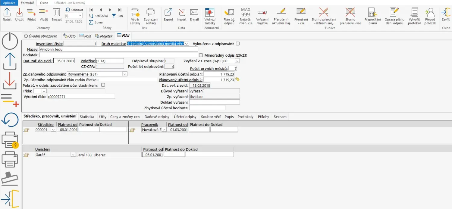 - Komplexní karta majetku: Veškeré údaje na jednom místě – od data pořízení a odpisové skupiny až po historii změn ceny, technické zhodnocení a dokumentaci.